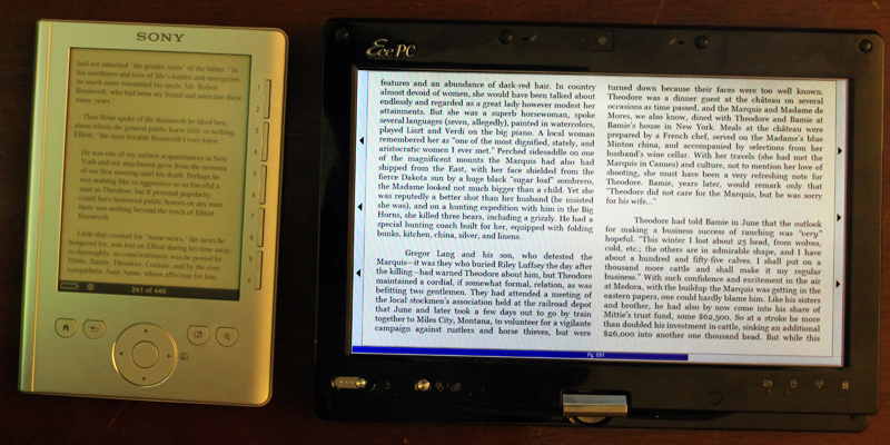 THE SOLUTION WAS THE INTRODUCTION OF AFFORDABLE TABLET NETBOOKS The solution that worked for me was the introduction of affordable tablet style netbooks with touch screen technology. A few have already made it to the market. Currently they are a bit pricey, but as more models reach the market the competition should not only lower the prices but increase their usability by providing more horsepower with longer battery time. ASUS T91MT TABLET NETBOOK After doing some Googling and research I found the Asus T91MT, a 2.1 lb netbook with a 8.9 inch display. But instead of the typical clamshell design, Asus made the LCD screen capable of being rotated and folded back onto the keyboard to form a tablet netbook. (See photos below.) They added a resistive touch screen that is very responsive to fingers or a stylus. The result is a device that makes a really great eBook reader and has full computer functionality. I'm not suggesting you buy this model, but I am suggesting that you buy into the form factor--a netbook tablet running Windows (or any appropriate OS for which eBook reading software is readily available). I spent a little less than $500 for my Asus T91MT--about the price of the lowest end iPad. As stated I bought the T91MT and then set out to turn it into my ultimate eBook reader. STEP 1: The first thing I did was to increase the RAM to 2GB, the maximum allowed on this model. This was the only additional cost, and it was about $40. STEP 2: I uninstalled a lot of the OEM software that I would never use but that runs in the background or starts up automatically when the computer is turned on. All PCs come with this extra baggage and it does little more than slow down the system. STEP 3: I ran MSCONFIG and turned off any unnecessary services which only serve to slow down the system. I also unchecked several startup items that don't need to automatically start every time you turn on the computer. You can uncheck anything from Adobe or Apple. Anything else you can Google to see if it is needed or if it can safely be unchecked. You will be amazed at how much this will speed up a marginal system like a netbook. STEP 4: I installed all the eBook related software. You be the judge here as everyone has their own preferences. But here are my preferences. MobiPocket Reader. FREE. This is my favorite. It is highly customizable and works well with .mobi and other formats. FBReader. FREE. This is one of the best ePub readers for the PC. Kindle for PC. FREE. Not very customizable, but you can download and read Kindle eBooks. eReader. FREE. This was originally written for Palm PDAs many years ago. The reader is pretty good on the PC and allows you to read .pdb and .prc eBooks. It is the program on which the Barnes and Noble Desktop eReader was based, but it is better than its successor both in functionality and in the interface. Adobe Acrobat Reader. FREE. Highly recommend for PDFs. A bit bloated, but still a great PDF viewer. Far superior to Foxit Reader when rendering in portrait view, and about the same as Foxit when rendering in landscape view. Foxit Reader. FREE. An alternative for PDFs. Though certainly less bloated than Adobe Acrobat Reader, it cannot compare with Acrobat's portrait view rendering. However, landscape view rendering is on par with Acrobat. Calibre. FREE. The reader is not very good, and you probably won't need the sync function since you are using your PC for a reader. However, this is must have software for converting non-DRMed eBooks to other formats. It is also good for changing metadata and improving the formats on non-DRMed eBooks. Sony Reader Library. FREE. This is terrible software, but you might need it if you have a Sony Reader. Otherwise I do not recommend it. Barnes and Noble Desktop eReader. FREE. This is nearly as bad as the Sony Reader Library. I do not recommend it. Stanza. FREE. This is the worst of the readers. It requires the Java Runtime Environment, which slows down a netbook to a crawl. The interface is elementary and not conducive to tablet mode. And rather than using pages it scrolls through a section like an HTML page in a browser. I do not recommend it. I also highly recommend a good office suite such as Microsoft Office 2007 or Open Office. Your netbook probably comes with an office suite installed, at least a trial version. If not and you don't want to purchase MS Office 2007, you can always download the free readers. PHOTOS OF MY ASUS T91MT TABLET NETBOOK AS AN EBOOK READER The following photos show my ASUS T91MT along with a Sony PRS-300 for comparison. I'm running MobiPocket Reader in The photos. NOTE: These photos really do not do justice to the Asus or sony screens. Both screens are much better looking in real life. Last edited by jswinden; 02-21-2010 at 04:58 PM. |