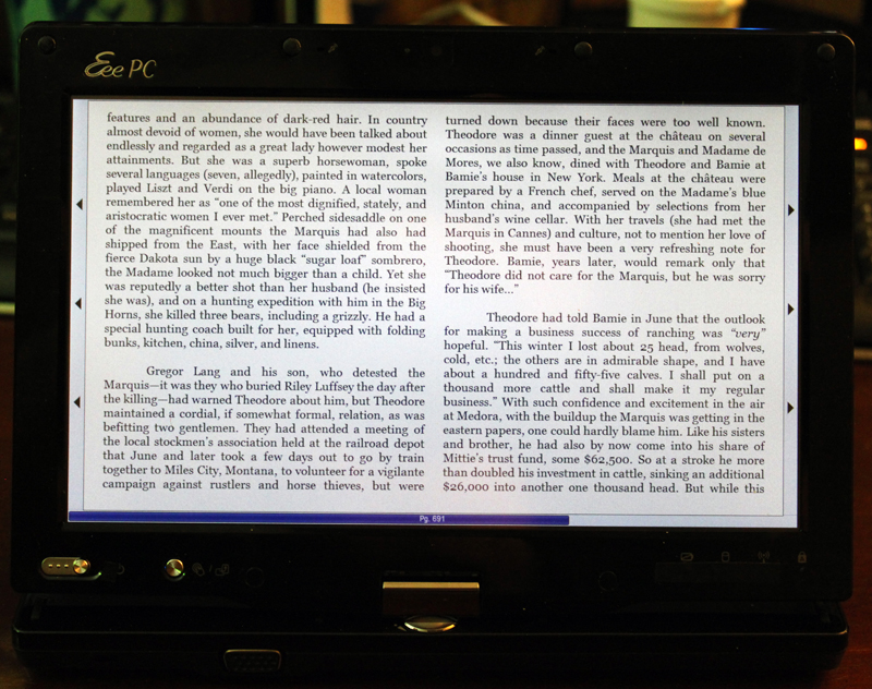 For my tastes, the eReader interface is much more intuitive and easier to use, and it takes up more of the screen in Fullscreen mode than does the B&N Reader. It also seems a bit faster than the B&N Reader. However, eReader only displays .pdb and .prc eBook formats while the B&N Reader displays .pdb and .prc and ePub formats. I would definately choose FBReader over the B&N Reader for ePub though. Note: The screenshots are rendered poorly by the forum software. In reality they are both clear and crisp with the text. The screen resolution on the Asus T91MT is 1024 x 600. [EDIT] I found this section in the Barnes & Noble Desktop eReader User Guide: RETIRED FEATURES As part of 2.0, we retired some features. These may resurface in the future or we may have new features – stay tuned!