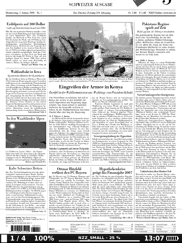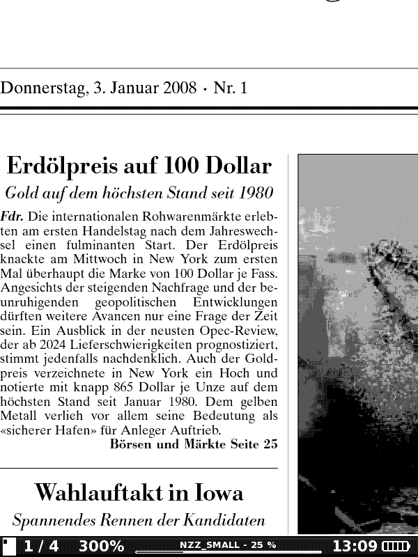 - ePaper einer Zeitung. Klar, ist grundsätzlich mal nicht die erste Anwendung eines 6"-PBs, würd mich aber doch interessieren. Als Beispiel (und damit hab ich mich auch gleich als Schweizer geoutet): NZZ (riesiges PDF). Geht so ein grosses PDF auf das PB302? Ich habe eine Selektion von 4 Seiten aus dem verlinkten PDF angehängt, die mich besonders interessieren (Titel, eine normale Seite, Wetter, eine Seite mit einer Tabelle). Attachment 50904 Natürlich eignet sich auch jede andere Zeitung für so einen allgemein nützlichen Screenshot. Dummerweise gibt es die Zeitungen, die mich interessieren nicht als richtiges "eBook", darum würde mich die Eignung des PDF fürs PB interessieren. Es reicht auch eine oder zwei Seiten aus dem PDF, Ulli. Das Copyright dürfte kein Problem sein, das verlinkte PDF ist als "Beispiel" für den kostenpflichtigen Service frei verfügbar.