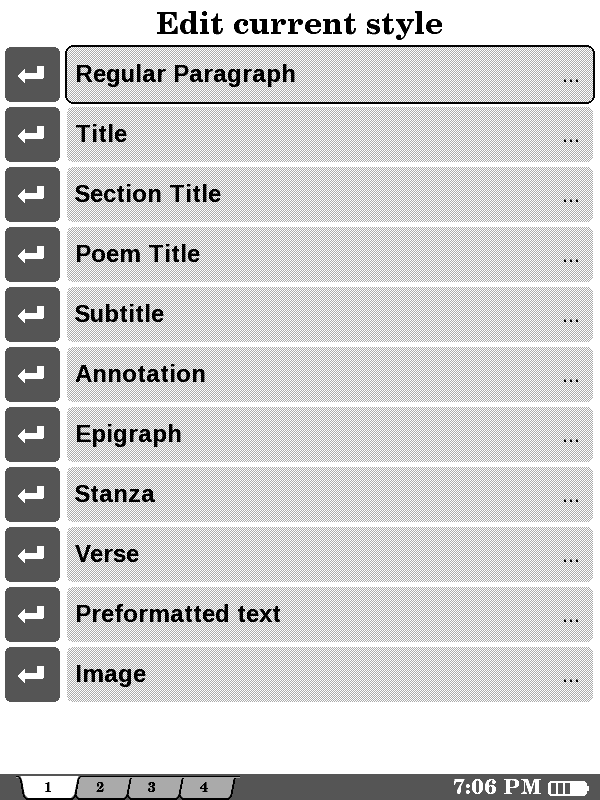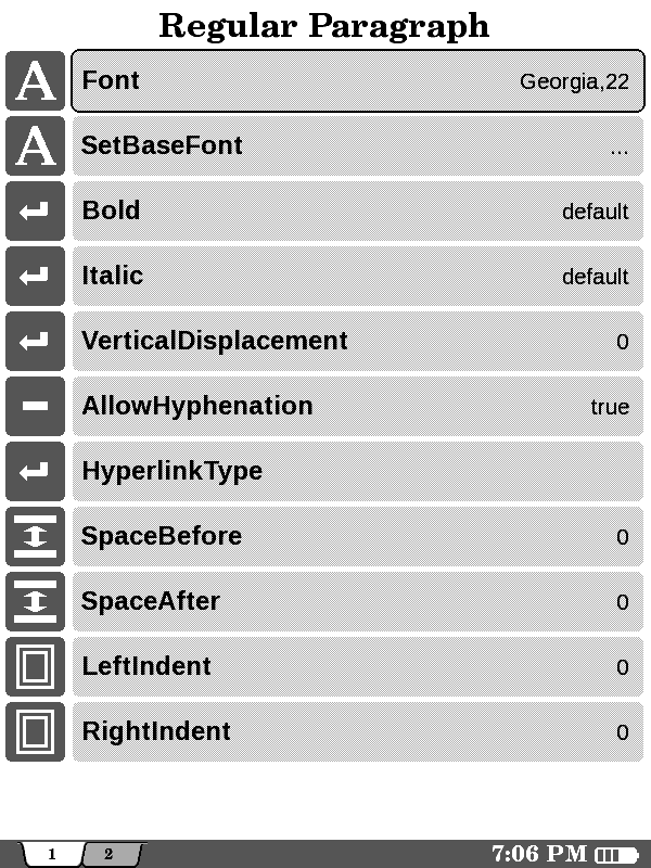Not much fun to have to rebuild an ebook just so you can read it *your* way, right? For DRM-free ebooks you just set the global overrides in the FBReader 180 settings page for those tags you want overidden, presumably body text. For DRM'ed ebooks, you edit the *external* userstyle1.css file, *once*, and that should do the trick for all ebooks you open. Edit: see attached screenshots for how the FBReader styles are edited. The Edit Current style screen offers up 4 pages worth of adjustable styles. The very first of which is Regular Paragraph, which has two pages of tweakable settings. On the second page, you set alignment between default (whatever the ebooks asks for), left align (as shown in the third screenshot), right align, centered, or justified. No ebook editing required. Last edited by fjtorres; 05-30-2010 at 08:23 PM. Reason: Screenshot attachment |