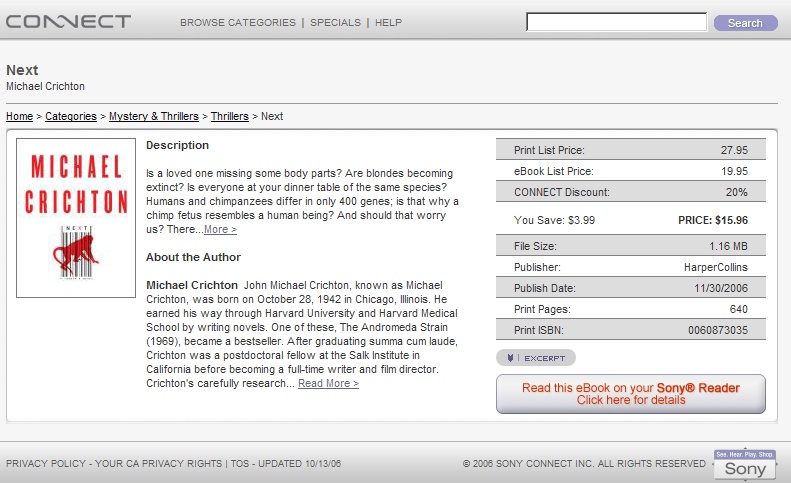 According to Sony's online store, Crichton's new novel Next is available for $15.96 (screenshot). But when I click on it (link: http://ebooks.connect.com/product/40...000048657.html) the store says "An error has occurred" (screenshot).