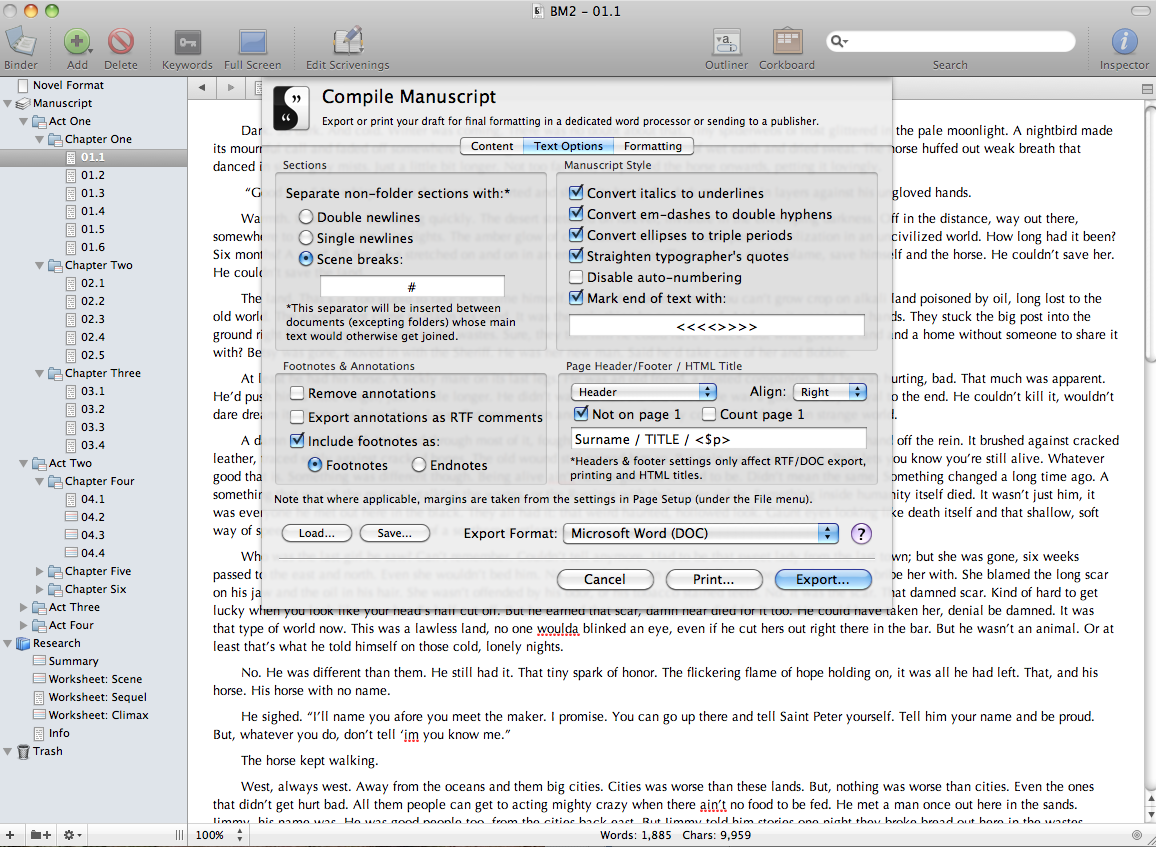 I love Scrivener. But, it has its flaws. Mostly, it doesn't play well with Pages. I've had all sorts of formatting issues when using Pages as a tool to export into. Since you are writing a nonfiction book, the question becomes what kind of formatting are you looking for? Do you have end notes and stuff that need to be kept in the format? I've never really had to experiment with them. Since Scrivener basically turns your document into a giant zip file with RTF text, you need to take some extra care with some exports. I write primarily using the "Novel Standard Manuscript Format" template. I try to keep everything organized in separate folders, as you can see from the attached images. When I finish my work I go to File - Compile Manuscript If you have a bunch of footnotes/endnotes, you're going to have to play with the settings there until you get something you like. I tend to leave all the settings at default and export it to Microsoft Word. And here's where things get complicated. I have Parallells with a copy of W7 and OfficeXP (The last good M$ product) I also have the short lived "Read on Microsoft Reader" macro. This converts your word document into a Microsoft LIT file. Since Scrivener talks to Microsoft Word better than it talks to Pages and Open Office, my formatting is pretty much kept intact. I then save the LIT file with whatever metadata and cover that I want. My next step is to load up Calibre and convert my LIT file to ePub / LRF / Mobi / whatever else you want to use. I don't know how many people read Beyond the Black when I posted it up, but I asked for people to point out whatever formatting issues they could find. I didn't get any complaints. I've also pretty much have every current digital device and checked my documents out in them. I haven't had any issues. There may be others on here with easier methods, but this is mine. Good luck!! ![]() *Edit!* I uploaded the images in the wrong order. Image 3 is the basic Scrivener writing screen when I work on my stuff. Image 1 is after I go to the File - Compile Manuscript menu option. Image 4 is after exporting the Scrivener file to a Word Document Image 2 is the only metadata editing I need to do in RMR. As you can see from the word screen, that's pretty much what I export it as. Courier 12pt, double space 1" margins all around. It's designed to be printed out and read on your basic letter paper. .. .. but, it seemed to work just as well in digital. Last edited by jaxx6166; 07-05-2010 at 07:09 PM. Reason: Images out of order. |