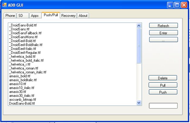 http://forum.xda-developers.com/show....php?p=4869749 I need to use wifi to connect my Nook with normal command line first (adb connect...) before I run this software. It will then auto detect my Nook. I can browse several system folders, can push/pull, delete files by using this gui, , install application, and many more. I try to find where Nook keeps its fonts for content display (Helvetica Neue, etc) to no avail! Exploring how this could help me do things easier because I'm not a techie guy. Last edited by bthoven; 03-15-2010 at 07:21 AM. |