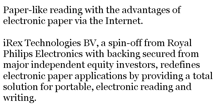 I love iLiad and the display is perfect, but I think that my iLiad can more: I noticed that letters on virtual keyboard look more sharp than letters displayed in PDF textes. After long investigation I found that as in Acrobat Reader, iRead (in xPDF) uses simple bilinear resizing of text symbols and all letters a little blurred, not enough crisp, and gritty. After this I captured screenshot of this text in Word to BMP image and then transferred file to iLiad. Note that I don't use ClearType. I was totally impressed how good iLiad displayed same text as BMP file image now! Very crisp, but antialiased symbols! So you see that your iLiad can more! If you will test this moment, note that image should be a little smaller than display to prevent resizing of an image. The question. How to prepare book in pre-rendered images? I don't know how to create PDF file with rightly calculated size of images to prevent resizing of BMP images. I again should say that iLiad is amazing ebook, and I think that Sony/Hanlin uses same text rendering problem because Microsoft uses special high quality antialiasing of text. |