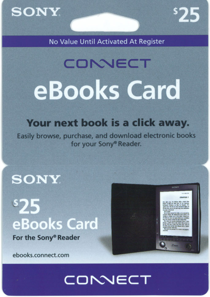 Ah, the rumor mill -- what a boring life we'd all lead without it. It's possible, very possible in fact (since I have two shiny plastic cards in my own hands), that retail stores like Borders or Sony Style may soon begin merchandising physical gift certificate cards for e-books from Sony Connect. You know, these are the cards that are usually displayed on racks near greeting cards and photo departments, and that have no value until they are activated at the cash register.This would be pretty awesome for everyone who doesn't want to or cannot use his credit card to buy e-books from Sony online. |