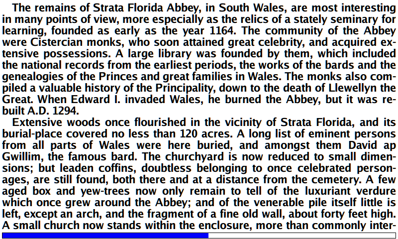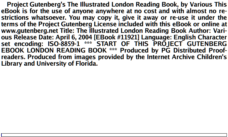 I used the HTML version of IllustratedLondonReader from Project Gutenberg, because deadite66 suggested that MobiPocket displays HTML. I think it is more accurate to say that MobiPocket imports HTML. Under Windows I imported the HTML using the new (beta) version 6.0 MobiPocket Reader, and copied the resulting .prc file to my PP3. The first 3 screen shots are from this document using the Java MobiPocket Reader. The graphics display well (smaller than the originals), but the reader is much less customizable than (say) the Windows 5.2 version. In particular the line spacing (double?) and the margins (very large) are not under user control. You can select the font and the font size. There are no rotation or page layout options. The PP3 isn't very comfortable in portrait mode, but a lack of screen rotation options might be significant on the iLiad. The next 3 screen shots are from the same file using FBReader (note that Abbey is in blue because I searched for this word). All its display characteristics are under user control, and I have it setup to display much more text per screen in a bold font. The page can be rotated (+90, +180, +270 degrees). However, it does not detect the hyperlinks in the .prc (actually .mobi) file. In fact, the PP3 and the Windows MobiPocket Readers have a hyperlinked CONTENTS section within the document but no "table of contents" in the menu, and FBReader has a table of contents in its menu but no in-line hyperlinks. FBReader can presumably be updated to detect the links. I tried a .prc from Baen, and it has a table of contents that is in the menu of all three readers. FBReader reads HTML directly, and the last 3 screen shots are FBReader on the original (zipped) HTML file. It now detects the hyperlinks. I also show one screen with the FBReader top panel, rather than in full screen mode. Note that the progress bar at the bottom can also be removed if you want. The PP3 Java version was ported by Pepper, and MobiPocket says that Pepper is in charge of how much functionality to provide. So it isn't clear if the Java version is actually much less capable than other versions of MobiPocket reader, or if Pepper did a minimal port. In any case, given the availability of FBRreader, I will only use the PP3 Mobi Reader if I ever buy an encripted e-book. Last edited by wallcraft; 01-30-2007 at 12:58 AM. |