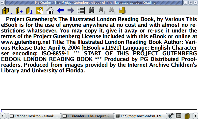 I probably put too much stuff on the post about FBReader, but this does show that the PP3 MobiPocket reader is less capable than it could be (and the open source FBReader could be ported to the iLiad too). The Windows MobiPocket Reader is very capable, and as I said in the original post I don't know if the PP3 versions limitations are intrinsic to the Java Reader or due to choices made by Pepper about what features to make available. |