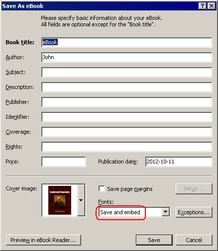Please click the "Exceptions..." button in the "Save as eBook" dialog. Are there any fonts checked? Could you please email your document file (RTF, DOC, or DOCX) to support@AtlantisWordProcessor.com? Could you please email your current Atlantis settings to support@AtlantisWordProcessor.com? Please choose the "Tools | Options..." menu command of Atlantis, click the "Save to File..." button, and save your current Atlantis settings as "Atlantis.ini". Please email this .ini file to support@AtlantisWordProcessor.com. |