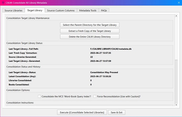 Anyways, so far so good on the get custom columns button, NO error popups and the log says all good in attach, so it seems to be working All of the test libraries show up, with their custom columns.Here's the log, in case I missed something: susan@localhost:~> calibre-debug --gui calibre 6.11 embedded-python: False Linux-6.1.8-1-default-x86_64-with-glibc2.36 Linux ('64bit', 'ELF') ('Linux', '6.1.8-1-default', '#1 SMP PREEMPT_DYNAMIC Tue Jan 24 06:29:25 UTC 2023 (baebfe0)') Python 3.10.9 Interface language: None Successfully initialized third party plugins: Consolidate All Library Metadata (2, 0, 45) && Job Spy (1, 0, 202) && MultiColumnSearch (1, 0, 96) && View Manager (1, 10, 2) QPA platform: xcb devicePixelRatio: 1.0 logicalDpi: 96.0 x 96.0 physicalDpi: 102.23899371069182 x 102.35820895522387 ApplicationPaletteChange event ignored Using calibre Qt style: True [0.00] Starting up... [0.00] Showing splash screen... [0.03] splash screen shown [0.03] Initializing db... [0.04] db initialized [0.04] Constructing main UI... Screens currently in system: {'depth': 24, 'device_pixel_ratio': 1.0, 'geometry_in_logical_pixels': {'height': 1080, 'width': 1920, 'x': 0, 'y': 0}, 'index_in_screens_list': 0, 'manufacturer': 'ViewSonic Corporation', 'model': 'VX2250 SERIES', 'name': 'DVI-I-1', 'serial': 'RWS102406078-', 'size_in_logical_pixels': {'height': 1080, 'width': 1920}, 'virtual_geometry': {'height': 1080, 'width': 1920, 'x': 0, 'y': 0}} Restoring geometry for: calibre_main_window_geometry {'frame_geometry': {'height': 1036, 'width': 1920, 'x': 0, 'y': 0}, 'full_screened': False, 'geometry': {'height': 1005, 'width': 1920, 'x': 0, 'y': 31}, 'maximized': True, 'normal_geometry': {'height': 1005, 'width': 1920, 'x': 0, 'y': 31}, 'screen': {'depth': 24, 'device_pixel_ratio': 1.0, 'geometry_in_logical_pixels': {'height': 1080, 'width': 1920, 'x': 0, 'y': 0}, 'index_in_screens_list': 0, 'manufacturer': 'ViewSonic Corporation', 'model': 'VX2250 SERIES', 'name': 'DVI-I-1', 'serial': 'RWS102406078-', 'size_in_logical_pixels': {'height': 1080, 'width': 1920}, 'virtual_geometry': {'height': 1080, 'width': 1920, 'x': 0, 'y': 0}}} Matching screen: {'depth': 24, 'device_pixel_ratio': 1.0, 'geometry_in_logical_pixels': {'height': 1080, 'width': 1920, 'x': 0, 'y': 0}, 'index_in_screens_list': 0, 'manufacturer': 'ViewSonic Corporation', 'model': 'VX2250 SERIES', 'name': 'DVI-I-1', 'serial': 'RWS102406078-', 'size_in_logical_pixels': {'height': 1080, 'width': 1920}, 'virtual_geometry': {'height': 1080, 'width': 1920, 'x': 0, 'y': 0}} Setting widget geometry to: {'height': 1005, 'width': 1920, 'x': 0, 'y': 31} Restoring widget to maximized CALM: initialization_complete............ Job Spy has begun initialization... Calibre, and hence Job Spy, was gracefully shut down last time? True Last time daemon started: never Last time daemon failed: never Total daemon starts inception_to_date: 0 Total daemon failures inception-to-date: 0 qt.gui.imageio: libpng warning: iCCP: known incorrect sRGB profile JS: ===>>> change_gui_alternating_row_colors() Job Spy has finished initialization... [0] un-optimized number of undesirable characters accumulated: 756 [1] optimized number of undesirable characters accumulated: 596 MCS has finished initialization... [1.60] main UI initialized... [1.60] Hiding splash screen Starting QuickView [1.75] splash screen hidden [1.75] Started up in 1.75 seconds with 467 books CALM_DB_VERSION_METADATA_DB 2 CALM_DB_VERSION_METADATA_TOOLS_DB 2 CALM_DB_VERSION_UPGRADE_FORCE_UPGRADE False CALM_DB_VERSION_UPGRADE_SUPPRESS_INFO_DIALOGS False CALM_FORCE_RECONSOLIDATION False CALM_LAST_CONSOLIDATION_JOB_DATETIME ...NEVER... CALM_LAST_CONSOLIDATION_NUMBER_BOOKS 0 CALM_LAST_CONSOLIDATION_NUMBER_LIBRARIES 0 CALM_LAST_CONSOLIDATION_TARGET_DB_FULL_PATH ZZ: CALM_MCS_INDEX_CONSOLIDATION False CALM_TARGET_DB_FULL_PATH /home/susan/Calibre/CALM/metadata.db CALM_TARGET_DB_GENERATING_NONCALM_LIBRARY_PATH ZZ:||>>>||ZZ: CALM_TARGET_DB_LAST_CHOSEN_LIBRARY_DIRECTORY ZZ: CALM_TARGET_DB_MUST_BE_REFRESHED False CALM_TARGET_PARENT_DIRECTORY /home/susan/Calibre CALM_USER_STATUS USER Number of keys in self.mysourceprefs in 'load_source_prefs_init' : 128 Number of keys in self.mysourceprefs in 'load_source_prefs' : 128 my_db.library_path: /home/susan/Calibre/LanguageandWriting self.target_db: /home/susan/Calibre/CALM/metadata.db filesystem_encoding is: utf-8 filesystem_encoding is: utf-8 Attaching to Tools DB: /home/susan/Calibre/CALM/metadata_tools.db n_tools_size = os.path.getsize(tools_path): 2260992 Number of keys in self.myparentprefs in 'child_invocation_of_save_real_prefs_parent' : 128 LIBRARY_PATH_03 : /home/susan/Calibre/LanguageandWriting LIBRARY_PATH_04 : /home/susan/Calibre/New Library LIBRARY_PATH_05 : /home/susan/Calibre/NewBooksForCalibre LIBRARY_PATH_06 : /home/susan/Calibre/Testlibrary number_source_libraries: 4 n_last_to_show: 6 n_tools_size = os.path.getsize(tools_path): 2260992 filesystem_encoding is: utf-8 metadata_tools.db is good to go. CALM_DB_VERSION_METADATA_DB 2 CALM_DB_VERSION_METADATA_TOOLS_DB 2 CALM_DB_VERSION_UPGRADE_FORCE_UPGRADE False CALM_DB_VERSION_UPGRADE_SUPPRESS_INFO_DIALOGS False CALM_FORCE_RECONSOLIDATION False CALM_LAST_CONSOLIDATION_JOB_DATETIME ...NEVER... CALM_LAST_CONSOLIDATION_NUMBER_BOOKS 0 CALM_LAST_CONSOLIDATION_NUMBER_LIBRARIES 0 CALM_LAST_CONSOLIDATION_TARGET_DB_FULL_PATH ZZ: CALM_MCS_INDEX_CONSOLIDATION False CALM_TARGET_DB_FULL_PATH /home/susan/Calibre/CALM/metadata.db CALM_TARGET_DB_GENERATING_NONCALM_LIBRARY_PATH ZZ:||>>>||ZZ: CALM_TARGET_DB_LAST_CHOSEN_LIBRARY_DIRECTORY ZZ: CALM_TARGET_DB_MUST_BE_REFRESHED False CALM_TARGET_PARENT_DIRECTORY /home/susan/Calibre CALM_USER_STATUS USER Number of keys in self.mysourceprefs in 'load_source_prefs_init' : 128 Number of keys in self.mysourceprefs in 'load_source_prefs' : 128 my_db.library_path: /home/susan/Calibre/LanguageandWriting self.target_db: /home/susan/Calibre/CALM/metadata.db Number of keys in self.mysourceprefs in 'save_sour