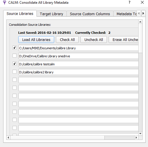 You need to start over from the beginning. Read and follow the instructions embedded in the Target Library Tab. You should first "Refresh" the Target Library. Then, specify the Source Libraries, which are your "real" Calibre libraries that have real books in them. Be sure to "save". Then, you must "Generate" your Source Custom Columns. You have never used the word "Generate", so I suspect you have not done so. It is required. Read the ToolTips on that Tab. After a successful Generation, you click the "Execute Consolidation" pushbutton on the Target Library Tab. Nuclear Option: If the above does not work, delete this file: C:\Users\Beltonmike\AppData\Roaming\calibre\plugin s\Consolidate All Library Metadata.json which is the configuration file that has been saved as a result of everything you have done so far. Then, manually delete the CALM target library (everything, including /CALM/ itself). Then start over from scratch. If you still have problems, you must attach to your next post "Screen Snips" (using the Windows 10 "Snipping Tool" located at "C:\WINDOWS\system32\SnippingTool.exe") of the first 3 Tabs. Also, attach the entire Job Log from the Consolidation Job after you copy it into a Notepad text file. DaltonST |