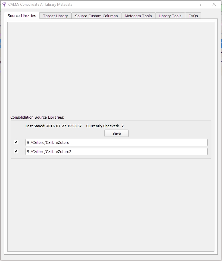 Until your list of Source Libraries is good, everything else will be wrong. Do not leave the Source Library Tab until it is correct. The first step is the Source Library Tab. That it why it is the first Tab. The Original Posts mentions OSX as regards calibredb. Be sure to read that and to install the Calibre command line programs per those instructions. CALM will fail quickly if calibredb has not been installed. DaltonST |