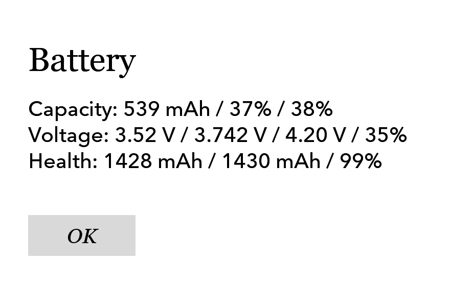 I am using your nm syntax (https://www.mobileread.com/forums/sh...&postcount=993) to get /sys/class/power_supply/ and compare to your latest battery calculation (image attached) The difference in current voltage is 4.11 vs 4.10, while the calculated percentage by dividing (current capacity / maximum capacity) is 81% So it is ok to use battery calculation for Libra to Clara 2E or does it need to be changed? Thanks |