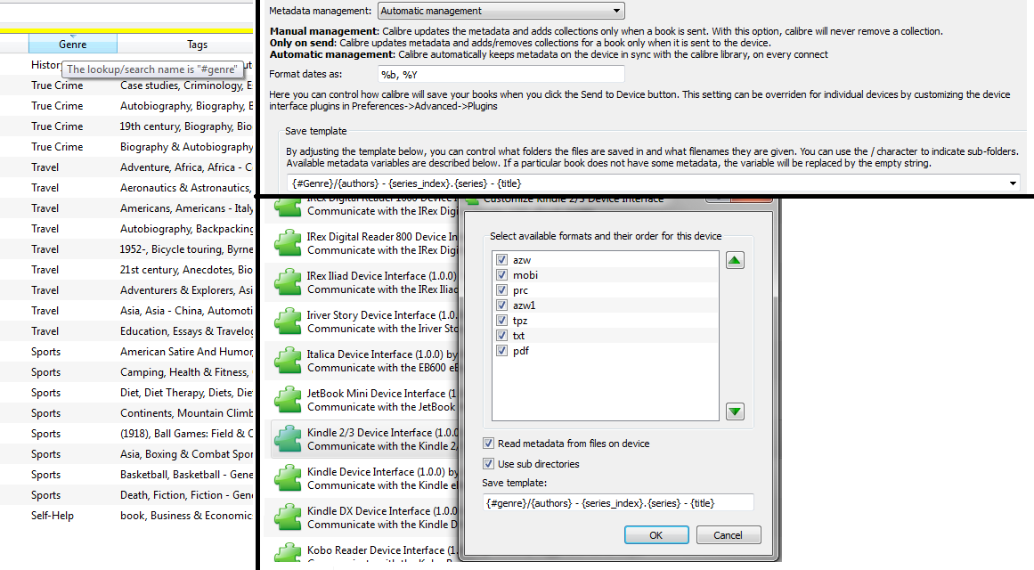 The workaround doesn't seem to work; it still makes a folder named #genre and puts all the books into it, but it's definitely referencing the Genre column correctly, because it put all the info from Genre into it's own column (named Type) properly, and it's naming the folder on my Kindle #genre, not #type, even though I made sure that {#type} is both in the general preferences spot and the plugin preferences spot. But I'm not worried, if doing it the proper way will work within a few weeks or sooner than that's good enough for me. The organization will be nice for the future but I can still find and read specific books for now just fine so I'm in no rush. Thank you so much Chaley, you're friggin' awesome! I also really appreciate your aide too, stevehaley, both of you are great. |