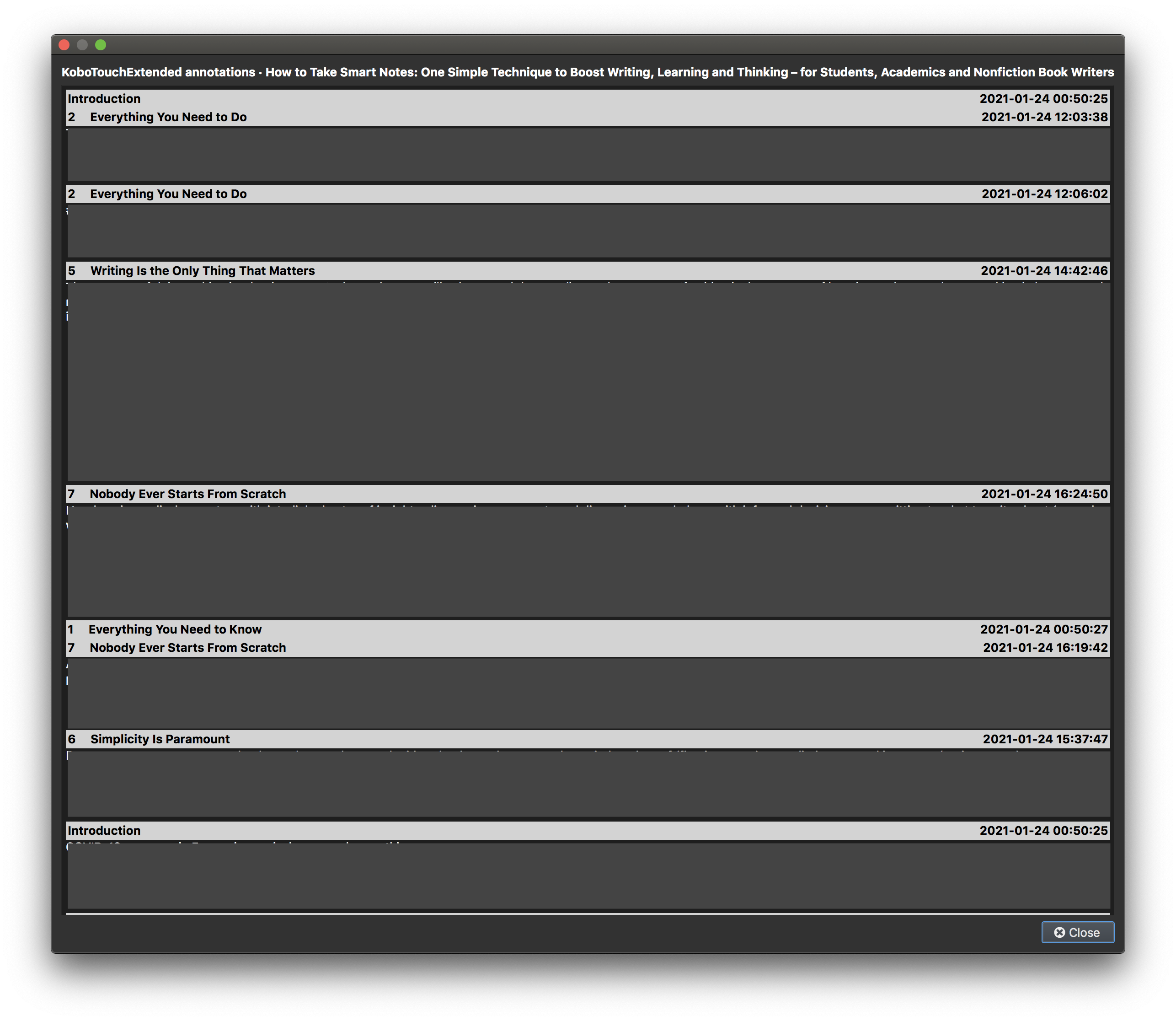 The annotations fetched are in a random order which is very hard to follow (see screenshot). It is neither in the chapter order or chronological order. Some notes seem to be either missing in location or indexed to more than one chapter. For example, the first note in the screenshot is under both ‘Introduction’ and Chapter 2. I am not sure whether there is a highlight missing under ‘Introduction’ or if the annotation from Chapter 2 below just got randomly anchored to also ‘Introduction’. Is there a way to extract annotations in a more logical order, such as following the chapter order or chronological, added order? Thanks a lot in advance. |