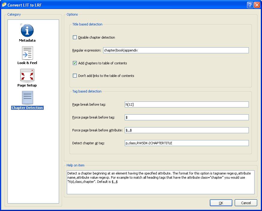 To add an internal TOC all a user has to do is select the “Insert TOC” button. Any text marked ‘Title’ ore ‘Sub Title’ will show up in the TOC. This steps below covers how to get external TOC on LRF books. Using Calibre with LIT If the user is using WordRMR to create LIT eBooks these are the additional steps required to get the external TOC working on an LRF eBook To get the external TOC to work in Calibre, only requires adding a switch to the conversion. NOTE: Calibe always inserts a page break a chapter. There is no way to disable this today. To avoid double page breaks run the “Find Chapter w/o Page Break”. In the “Chapter Detection” category enter the following text in the “Detect Chapter at tag:” edit box p,class, RWSDK-2CHAPTERTITLE SEE Calibe Conversion dialog image below Using MobiCreator to create an external TOC Since Mobicreator does not insert any page breaks prior to chapter it is best to use the "Auto Chapter..." option, located on the menu bar, if you wish to have page breaks for a new chapter. For the "Table of Contents" section in the MobiCreator tool insert the following text in the table. p,class,2CHAPTERTITLE p,class,21CHAPTERSUBTITLE See Mobi Image for an example Last edited by =X=; 10-30-2008 at 11:47 AM. Reason: Corrected error in text; reported by Ortep |