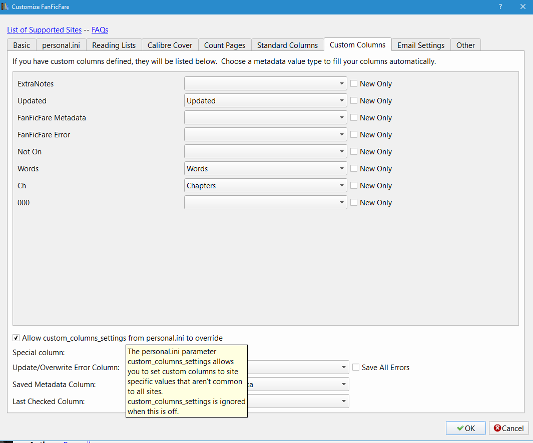 Site specific metadata (like prequelHTML for FimF or snapeflavours for potionsandsnitches.org to name just a couple) can only be set to custom columns using custom_columns_settings in personal.ini. That's because there are a ton of different site specific metadata items available and because users can add their own additional metadata items to do complex metadata manipulations on. You do have to have a GUI switch turned on to use custom_columns_settings however: |