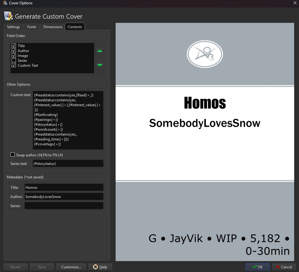 # don't do this: titlepage_start: <?xml version="1.0" encoding="UTF-8"?> <!DOCTYPE html PUBLIC "-//W3C//DTD XHTML 1.1//EN" "http://www.w3.org/TR/xhtml11/DTD/xhtml11.dtd"> ... # do this: titlepage_start:<?xml version="1.0" encoding="UTF-8"?> <!DOCTYPE html PUBLIC "-//W3C//DTD XHTML 1.1//EN" "http://www.w3.org/TR/xhtml11/DTD/xhtml11.dtd"> ... The answer to that is that the GC GUI selection uses FFF's site metadata entry--and you've changed it in replace_metadata. There are certain metadata entries FFF uses internally that, technically can be changed by the user, but will break certain features. Especially, storyUrl, but also site, & status. So: You can either not change site, use Default GUI GC instead of archiveofourown.org, or use generate_cover_settings to specify the GC setting to use. FYI, publisher is a copy of site that gets put in Calibre's Publisher field. That, you can safely change. From defaults.ini: Code: