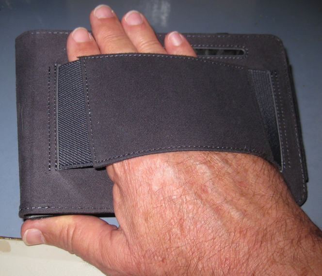 1. The sizing seems to be right on in my opinion. 2. The quality looks good. I don't see any bad stitching or uneven seams. 3. The corner attachments are elactic, but covered with leather in the area over the reader. They hold the K4 tightly in place. 4. The inside of the cover has a slit for storing money, credit cards, etc. I probably ever use this, but some people may like it. 5. The inside cover also has a hand hold with elastic at the ends. It is pretty handy to use. 6. There is an elastic band that you can use to hold the cover open or closed. The elastic seems strong, but we all know that elastic weakens and wears out with use. 7. I wanted the flip style to hold the K4 so I can read it while eating. After playing with it, it turns out that the optimum angle for me has the distance between the top & bottom edges at around 9 inches. This is too far for the reader to stand as the edges slide apart, letting the reader go flat. You can see in the photo the angle I like. I'll probably have to get some Velcro to hold the distance correct. Last edited by emoorman; 10-25-2011 at 04:16 PM. Reason: Add photo |