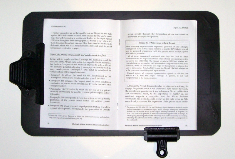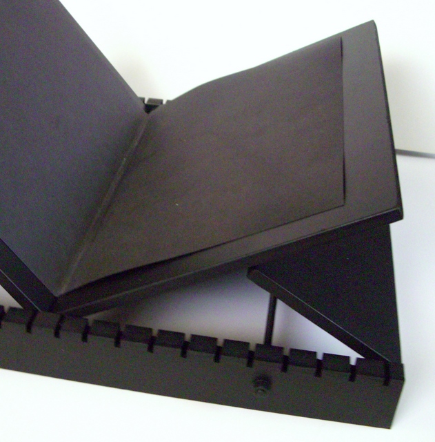 Apart from a v-shaped glass and a mechanism to raise it, my system does exactly the same plus a regulated angle, distance, and room for books of different thickness. Two cameras are no problem technically, they can both shoot automatically every nn seconds (at least my Canon can). The problem is quality. You should concentrate on making every shot picture perfect. Otherwise there is more manual work at the processing stage. Now I shoot all the odd pages and then all even pages just by turning pages and adjusting the distance from the tripod by a few milimeters every 20 or so pages. The book holder is just two panels with two hinged supports plus a heavy base with a lot of grooves. This is my patent You can regulate the distance between two panels, the angle of each panel, and the distance between the cradle and the tripod. The regulated v design is crucial to ensuring the angle between the lens and the book page at 90 degrees plus avoiding any skewing. Precise correction of angle and skewing with the tripod controls is very cumbersome. Since I installed my system, I do not touch my tripod any more (I miss my 7x zoom when taking photos of my garden birds - like the barbet in my avatar - with other 3x zoom cameras).As for cheap and dirty alternative you can make something similar from a cardboard. It was my first design. My wife used her scissors to make it in one hour or so. It worked perfectly. Remember, the devil is in the lighting and reflections, especially for color and glossy pages (or pages under glass). The disadvantages of cheap and dirty solution are: it is very light and therefore unstable, and you have to change tripod postion controls frequently to accomodate for various sizes of original pages, since moving the cradle further away creates a trapezoidal effect. You can avoid it with changing the angle in the v-cradle. The focus is quite forgiving in such a case (+/- a few milimeters difference in distance between the lens and upper and lower parts of the page do not show in repro). The advantage of the cardboard cradle is portability. Finally, you can always use the simplest solution: a friend or a document holder (picture attached) and soft flash plus a lot of processing to get pictures straight. You need a steady hand and a camera with a good automatic focus (out of my two Casios, ex-z850 does a better job than ex-z1000). Thanks for asking NatCh. |