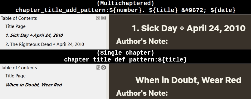 Plus with a chapter_title_x_pattern like ${number}. ${title} [${date}], the entry in the embedded TOC will have chapter_name [] if the work doesn't have the date_chapter metadata. I thought I'd try ${' [' + date + ']'}, but of course this is a different language so that didn't work.
