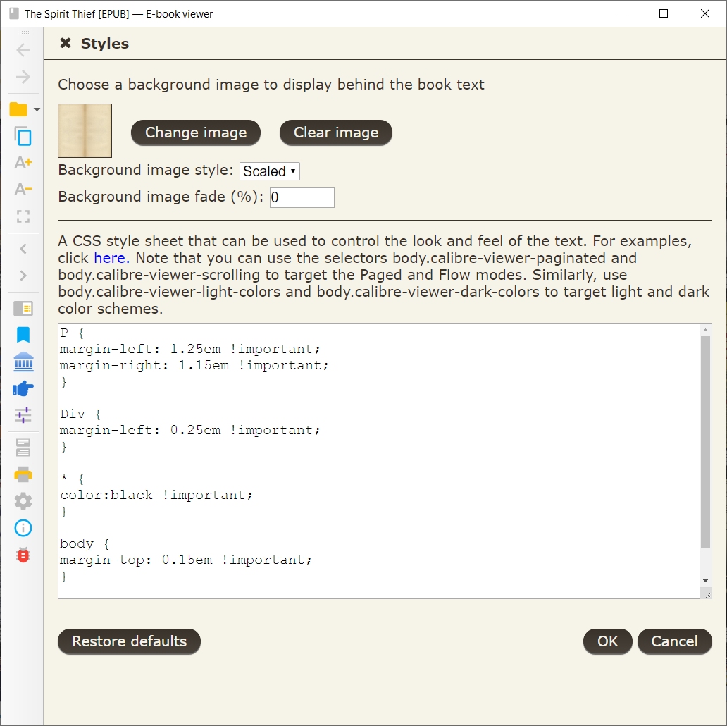 No special code. I described how I set things up in post 246. But I attached the adjustments I entered in Viewer - Preferences to get this look. Essentially no margins left, right or bottom. Change the color so the background and fore a different then add code in style to change the book text color back to black.