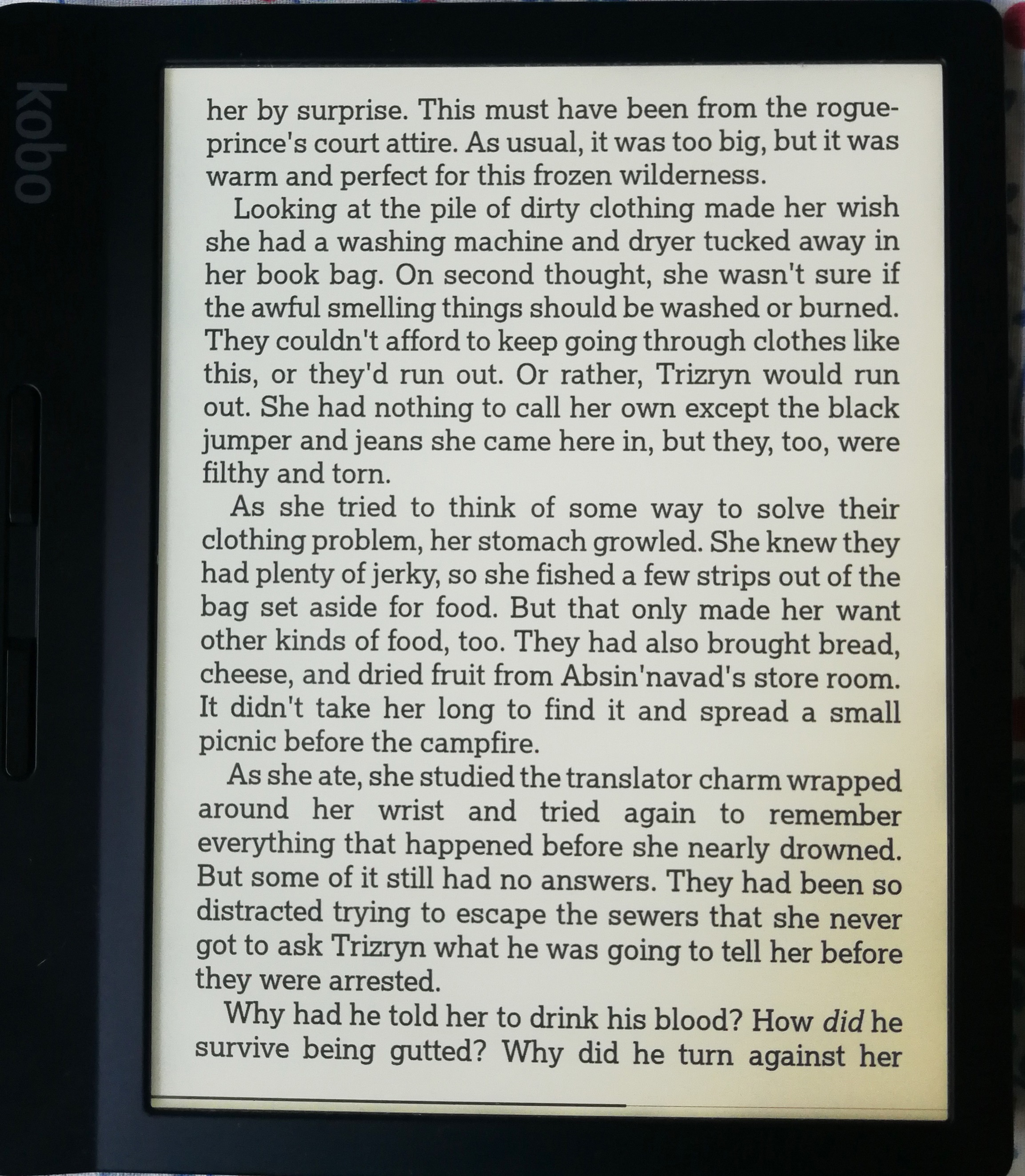 Also KOReader failed my ultimate test of large books, it crashed when trying to open the humongous Wheel of Time omnibus (almost 18 MB). Whereas both the kepub and epub default readers had no issues with it (other than RMSDK being incapable of searching for anything within it). |