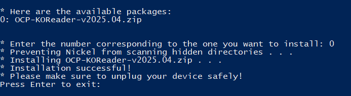I did everyting accordingly. Put the ocp.zip and install.ps1 (unblocked) in the same folder, run with powershell. After installation, I safely unplugged the device. Ah, one question here: everytime I eject the device on Windows, it appears that the device was succesfully ejected, but on kobo it looks as if it is still mounted. So I have to unplug so it can show the update screen. Is that normal? Then, I click on koreader on NickelMenu, but it only restarts the device. The same happens when I click on koreader on My Books. I tried several times, I did the real factory reset through developer options. I heard that some people owning clara bw with the latest firmware are having some issues to that regard, is that true? Could you help me with this situtation? I only get Kobo to have Koreader