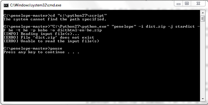 Indeed, the Penelope script gets executed when you run the Python interpreter (python.exe). === === === The -i flag accepts a path, either relative (like "dict.zip", which means "read the file dict.zip in the current directory") or absolute (like "C:\foo\dict.zip", which means "read the file dict.zip in the directory "foo" in drive "C:"). In the first screenshot Penelope was complaining that it cannot find "dict.zip" in the current directory. That's why the error went away when you copied the file in that directory. === === === About your problem: from the output, it looks like everything went OK, hence it is strange that the file was not created. (?) Instead of "-o dicthtml-he.zip", try using an absolute path: "-o C:\dicthtml-he.zip", and see if it solves the issue. You might want to add the "-d" flag to output debug messages too. |