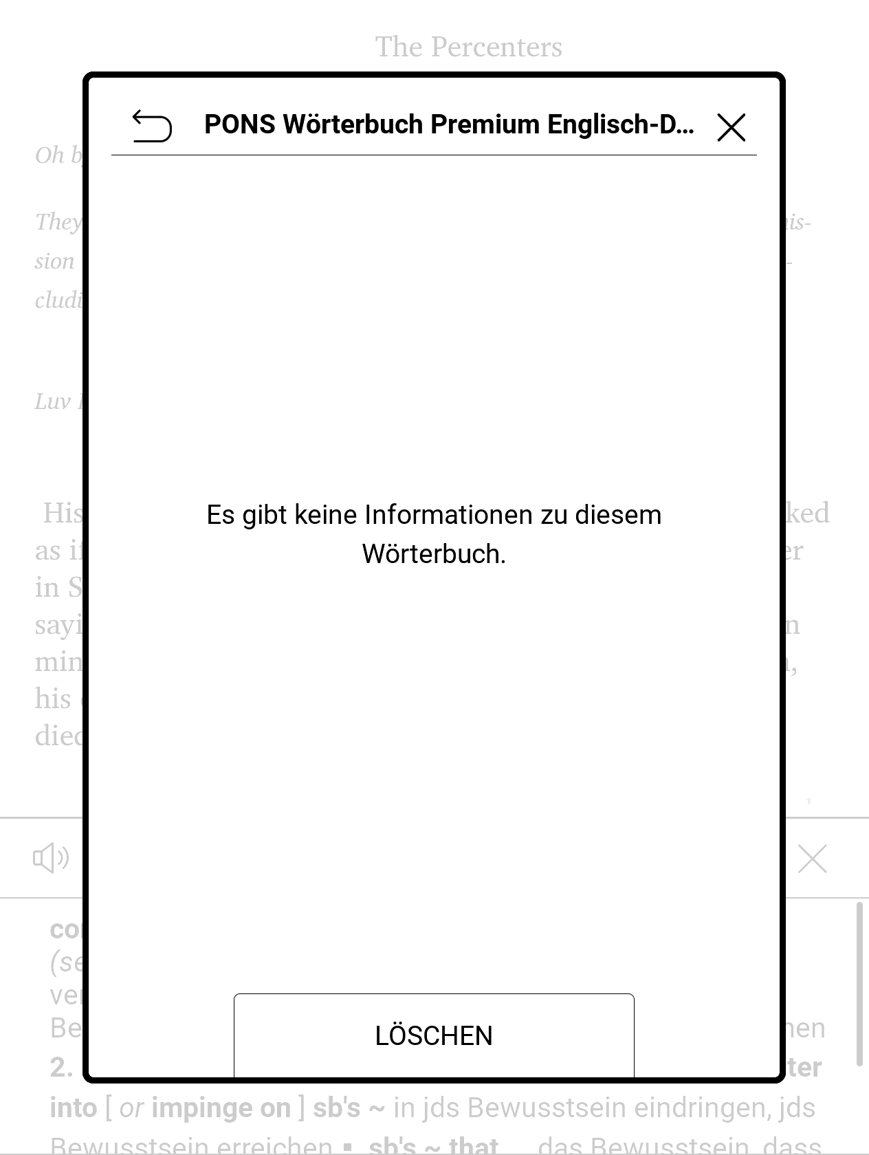 Could only test one dic after another. If you copy all three to the device, they appear under one name only, and you don’t know which it has taken. They also all appear under »Other« (»Andere« in German), instead of under »English → German«. I had to compress all screenshots into one ZIP (upload limits here), and also include a screenshot from the original Pocketbook English → German dictionary. On the Pocketbook, you have an app »Dictionary« as well as the (small) lookup area when reading a book. I enclose screenshots for both. For some reason, they all look alike. PONS Premium EN-DE_reconstructed_replacingEndTagParagraphWithBreak .dic Full: [ICODE]scr0022.bmp[/ICODE]Book: [ICODE]scr0023.bmp[/ICODE] PONS Premium EN-DE_reconstructed_replacingEndTagSpanWithBreak.dic Full: [ICODE]scr0024.bmp[/ICODE]Book: [ICODE]scr0025.bmp[/ICODE] PONS Premium EN-DE_reconstructed_retainingspan.dic Full: [ICODE]scr0026.bmp[/ICODE]Book: [ICODE]scr0027.bmp[/ICODE] Pocketbook English → German Full: [ICODE]scr0028.bmp[/ICODE] |