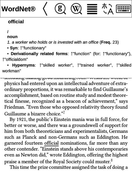I'm on W626.5.12.492 firmware version and Cool Reader cr3-v0.0.6-17-45.2-pro5. Before tampering with software versions I would recommend tinkering with CR settings regarding fonts, styles. Maybe it has something to do with internal CR settings instead of software version. If this does not help maybe switching to older versions of CR would help. The size of the font in the dictionary window when a word is not found (list of words mode) seems to reflect the upper bar of the dictionary window font size. This seems to be a feature introduced in later versions of CR or is related to some skin settings. For example - in v0.0.6-17-57 CR version there is the feature of "Automatically scale touch menu icons" - in v0.0.6-17-56 version there is a feature of "Dictionary font automatically scales for different resolutions" introduced. - in v0.0.6-17-55 there is a new feature: "Upped font sizes to 300px and status-bar font sizes to 100px" All these features may cause problems seen on your screenshots. My version has much smaller upper bar (see screenshot attached). Try older versions of CR. It won't hurt but might help ![]() https://github.com/blchinezu/pocketb...eader/releases Last edited by Serpico; 12-14-2016 at 09:25 PM. |
