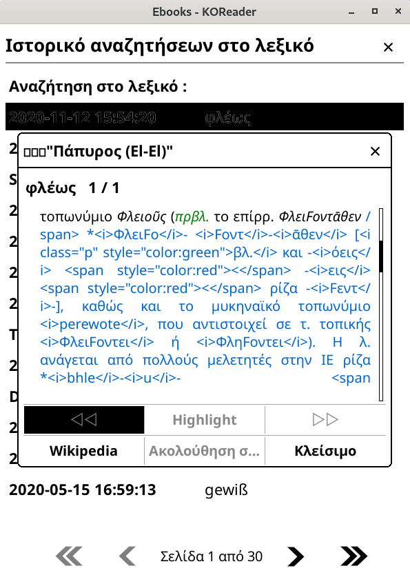 Actually, I can not search directly in the dictionary, because there is no option for Greek keyboard, but I can search a word of a text in the dictionary, both in pocketbook and KOReader, and through this dialog window I can search for other word too. Thank you! |