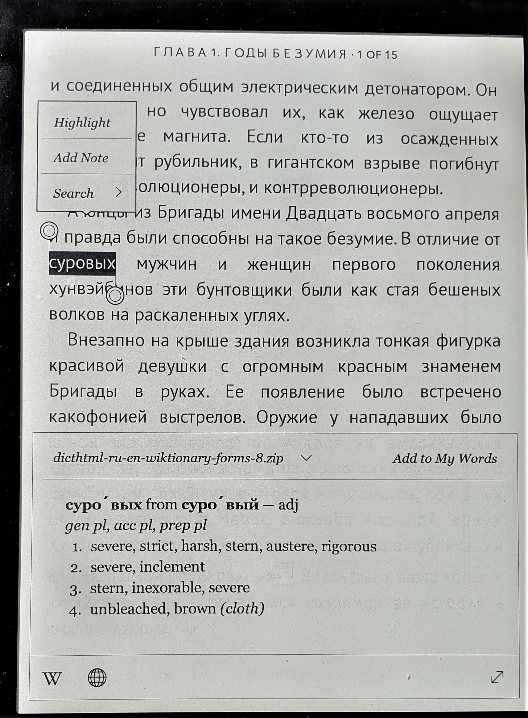 , maybe will share soon) Anyway, this is the new post, if someone can delete the old post...I am very proud to bring a fantastic Ru-En Russian dictionary to the Kobo. Based on the Russian Wiktionary it has several great features: 1. Vocabulary: 48 000 words (bigger vocab than ru-en Stardict) 2. Matching forms: 583 000 forms! 3. Shows the form of the selected word, for example, if it is genitive, or instrumental. Past, Future, imperative, participle, etc. 4. Shows the stress accent, so you know how to pronounce 5. Examples, all the great examples from Wiktionary 6. Romanized lookup, so it works great out of the box, without needing to install cyrillic keyboard. This is based on simplified romanization https://en.wikipedia.org/wiki/BGN/PC...ion_of_Russian The file is 26 MB, over the limit of uploads to mobileread. So you can download it over here. Download: https://translate.gburg.nl/dictionar...y-forms-10.zip Have fun! Last edited by Geert; 07-27-2022 at 01:01 PM. |