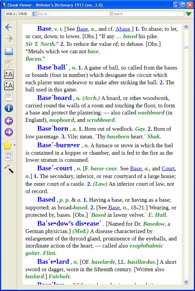 This ambitious project by The K-Dawg ( http://web.archive.org/web/200406061...adiocrypt.com/ ) updated the 1913 Webster's dictionary back in 2003 to include (sic) 125,970 searchable words!!! BTW, Easter egg alert, check the entry for 'K-Dawg, The' after the Ka words.... (Pompous comes to mind!) ![]() Note this webpage is no longer on the internet, but can still be found using the WayBackMachine at archive.org. The original Websters' Dictionary 2.0.rb (for the Rocket eBook reader) may not be still available there, but I have posted a copy of it here (15MB). The info extracted from that .rb is presented here: Quote: