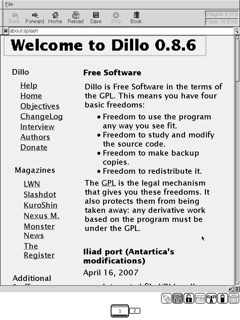 font_factor=2.0 panel_size=large However, I can't get bookmarks to work. They require dpid, which I thought was there now (for local files). I am using dillo-0.8.6_iliad-0.7. |
