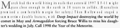 An example is attached. Has anyone worked out what causes this? A trace of the PDF decoding: Op = Tf:'F8', 1, Op = TD:8.473000, 0, Op = Tj:'publishes articles with a political or social', Op = TD:-12.350000, -1.198000, Op = Tc:-0.017000, Op = Tw:-0.022000, Op = TJ:['edge. WhereÕ', 75, 's the science? The three of them knew', 93, '.', ], Op = Tm:26.060000, 0, 0, 26.060000, 62.730000, 251.500000, Op = g:0.610000, Op = Tj:'M', Op = Tm:9.600000, 0, 0, 9.600000, 89.450000, 263, Op = g:0, Op = Tc:-0.013000, Op = Tw:-0.020000, Op = Tj:'arch had the world biting its nails that asteroid 1997 XF-11 might', Op = T*: Op = Tc:-0.012000, Op = Tw:0.058000, Op = TJ:['pass close enough to the ear', -8, 'th in 30 years to collide. (Reanalysis', ], Op = TD:-2.743000, -1.198000, Op = Tw:0.126000, Op = TJ:['promised a comfor', -6, 'table margin for safety', 87, '.) Then Hollywood staged a', ], Op = T*: Op = Tw:0.032000, Op = TJ:['summertime double featur', -6, 'e, with ', ], Op = Tf:'F10', 1, Op = TD:14.372000, 0, Op = Tj:'Deep Impact ', Op = Tf:'F8', 1, Op = TD:5.814000, 0, Op = Tj:'destroying the world by', Op = TD:-20.185000, -1.198000, Op = Tj:'comet in May and ', It is as though it has lost or corrupted the font info, and when the font gets reset everything looks ok again. Last edited by murraypaul; 02-11-2009 at 06:07 PM. |