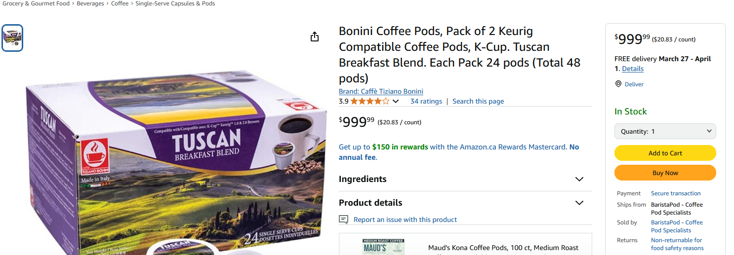 One friend of mine decided that I needed a heart attack and sent me the attached image from amazon.ca. The rest of the pages using their search terms didn't do much to help. When you see a box of Kirkland coffee pods that you can buy at the local Costco for less than $50 being sold for $85 or a pack that the local Walmart sells for $22 or 2 for $34 for $52. Sheesh, I know coffee is getting more expensive but when most of the coffee pods being sold are more expensive than trundling over to the local Starbucks for a grande Pike Place. I sorted by price high to low and even on the 4th page, the prices were ridiculously high compared to the local brick and mortar stores.