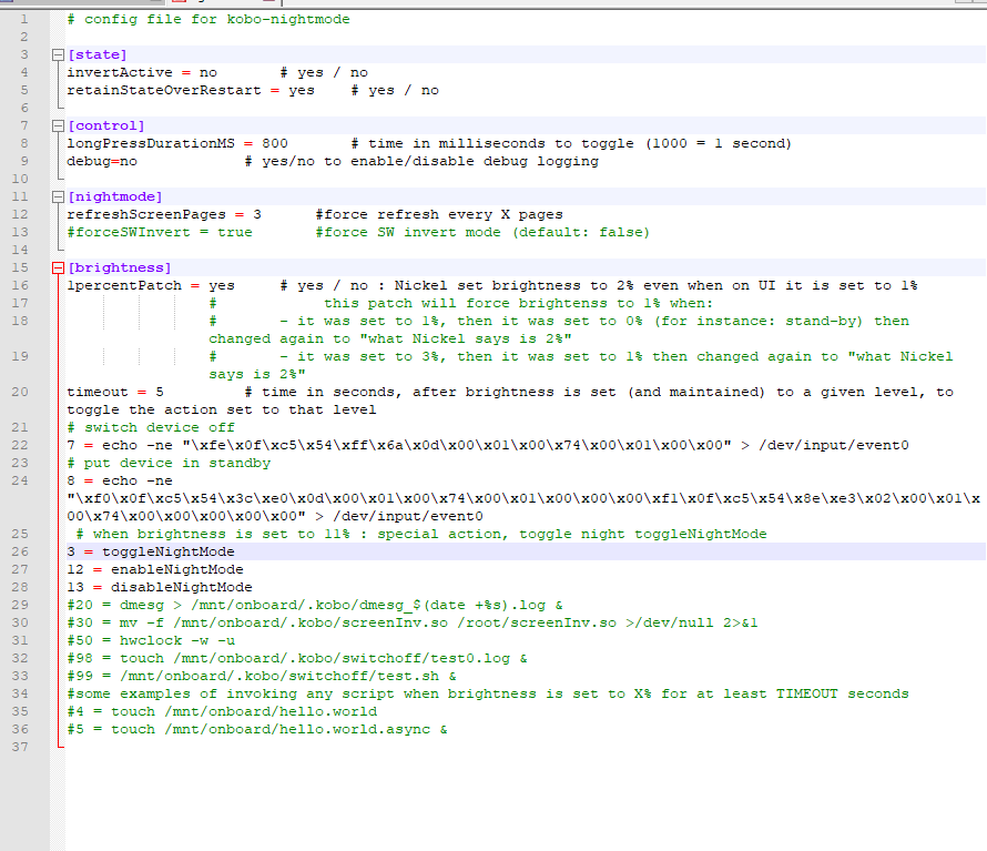 I got a little problem. I'm able to invert my Kobo (Aura Edition 2) without problems but only while modifying nightmode.ini. Below I have a picture from my ini. I have the newest update installed (4.9.11311) and got this installer. I would appreciate some help. I only got my Kobo today, but I'm used to read in nightmode on my tablet This "mod" was one reason to buy a kobo.Greetings! Minaru |