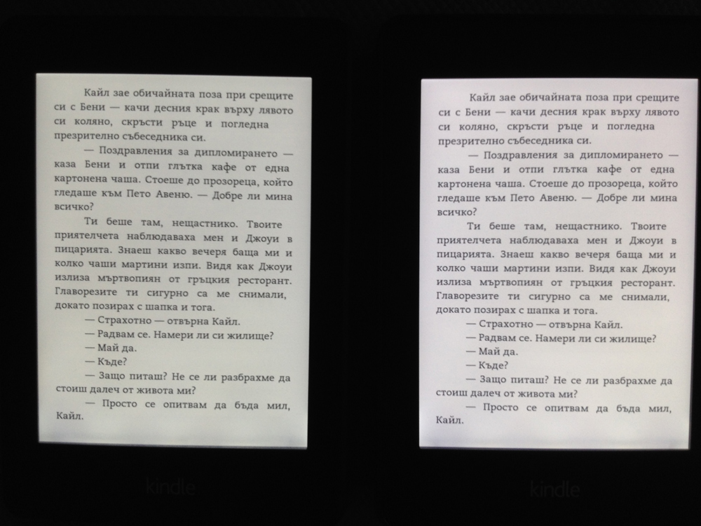 So far, I've been reading on a Pocketbook Touch Lux. Compared to the Kindle it looks quite slow and grey. I can't believe how bright the Kindle is! I put the two screens next to each other with full lights on and they were worlds apart. However, my PB has an even distribution of light whereas my Kindle has a shadow on the bottom left and a very bright spot on the bottom right. Reading during the day, it doesn't annoy me as much as I first thought it would. That's why I'm keeping it, escpecially after reading comments about dust under the screens or tilted screens. Luckily, I don't have these problems. I also love the responsiveness of the Kindle, being able to flip through pages with a preview and the footnotes pop-ups. Still, I'm taking my Pocketbook to bed with me. Simple reason: It shows the time in the status bar. Plus, it shows much more text on a single page, not having such wide margins as the Kindle. That's much more convenient for me when reading in bed. Another thing which could be better about the Kindle is the font size. The few serif fonts I like are either shown as a bit too small or a bit too big. And what about crashing on PDF files? That's really disappointing for such a high-end device. But on the whole it's really beautiful and I already love it.