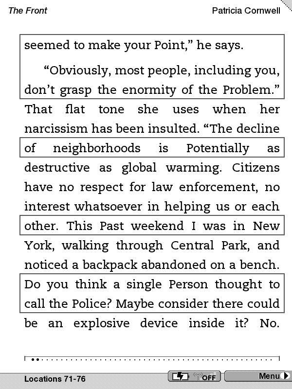 I just began to read Patricia Cornwell's The Front. I'm only about 4 or 5 pages in and keep getting distracted by a strange reoccurring formatting error. It's driving me nuts. It's pretty much on every page so far and usually more than once. I downloaded the book a while ago, so I'm passed the "get your money back" stage.