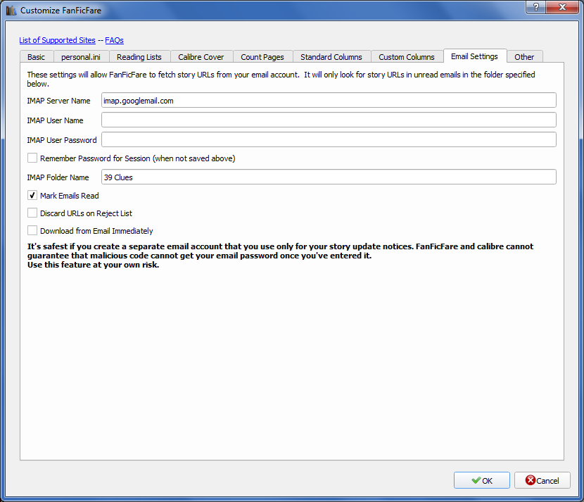 However, because it *does* check for starting/ending " and *not* quote strings that have them, it's safe for us to manually quote it. New test version (direct link). - Improvements to basic chapter_title_strip_pattern, add warning comments for same. - Add dblquotes around folder name on IMAP lookup. |
