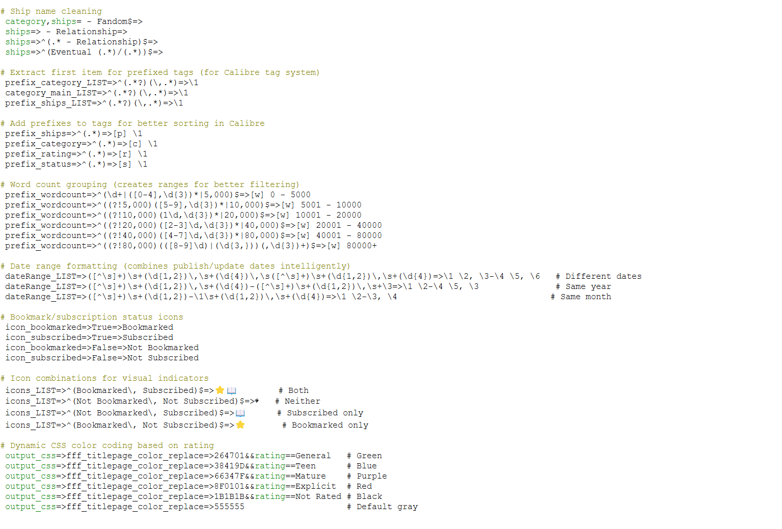I'm very bad with tech so learning how to use the personal.ini has been an adventure. I've used the defaults.ini, github and this thread as guides and have kind of frankensteined together my personal (a lot of it is copy and pasted script from this thread and because I still don't really know what I'm doing I can't tell where I'm going wrong). I only use AO3 so that's what I've configured my FFF for. I've made custom columns for the metadata but only my character and fandom custom columns are working. The custom columns that aren't working are Audience (for ratings), Fanfic Status and Ship. Under Preferences -> Add your own columns -> I also have Chapter Count, Kudos, Genre Tags that don't display in my Calibre library despite being ticked. What do I need to change to get those working? I hope this isn't too silly of a question. Any help would be appreciated! Below I've attached screenshots of my personal.ini but if there's a better way to share it please let me know. |