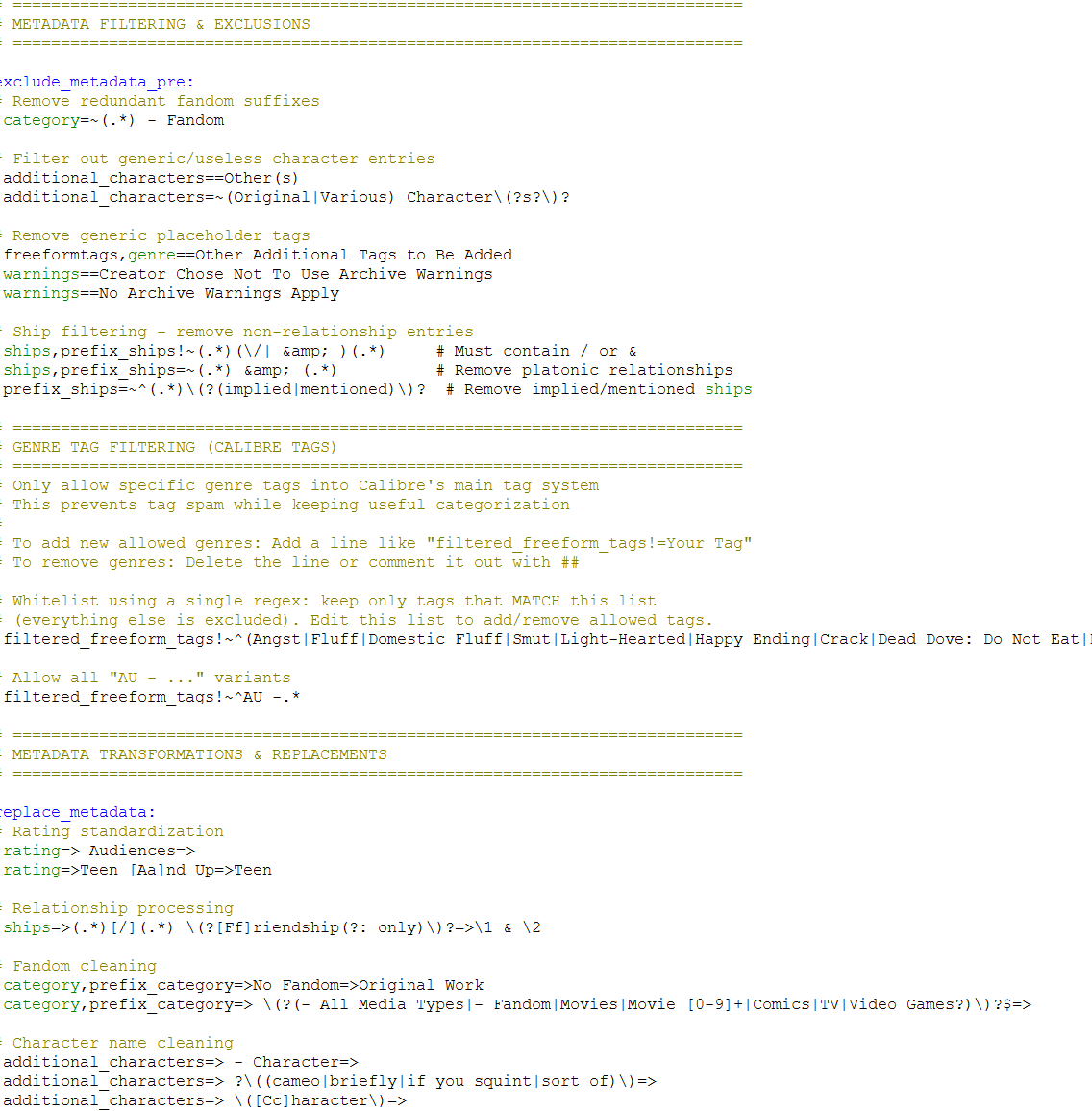 I'm very bad with tech so learning how to use the personal.ini has been an adventure. I've used the defaults.ini, github and this thread as guides and have kind of frankensteined together my personal (a lot of it is copy and pasted script from this thread and because I still don't really know what I'm doing I can't tell where I'm going wrong). I only use AO3 so that's what I've configured my FFF for. I've made custom columns for the metadata but only my character and fandom custom columns are working. The custom columns that aren't working are Audience (for ratings), Fanfic Status and Ship. Under Preferences -> Add your own columns -> I also have Chapter Count, Kudos, Genre Tags that don't display in my Calibre library despite being ticked. What do I need to change to get those working? I hope this isn't too silly of a question. Any help would be appreciated! Below I've attached screenshots of my personal.ini but if there's a better way to share it please let me know. |