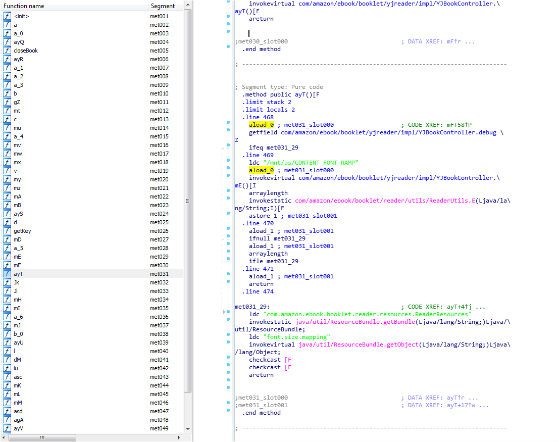 The code is from firmware 5.9.7 for PW3. As far as I've managed to understand the code if a field/member variable named "debug" wasn't set to "false" Kindle users would be able to re-define font sizes used for KFX books by creating a text file at "/mnt/us/CONTENT_FONT_RAMP" in the same way we can re-define font sizes for KF8 books by using "/mnt/us/FONT_RAMP". So a Java & Java ByteCode guy that is well versed in decompiling & recompiling code would probably just need to "toggle" that "debug" variable value to enable parsing of "CONTENT_FONT_RAMP" file. --------------------- EDIT: OK, I've just tested it an confirmed that it is working as expected. So, the only thing that needs to be changed is line 15 of init method of "YJBookController.class" before change: Code: