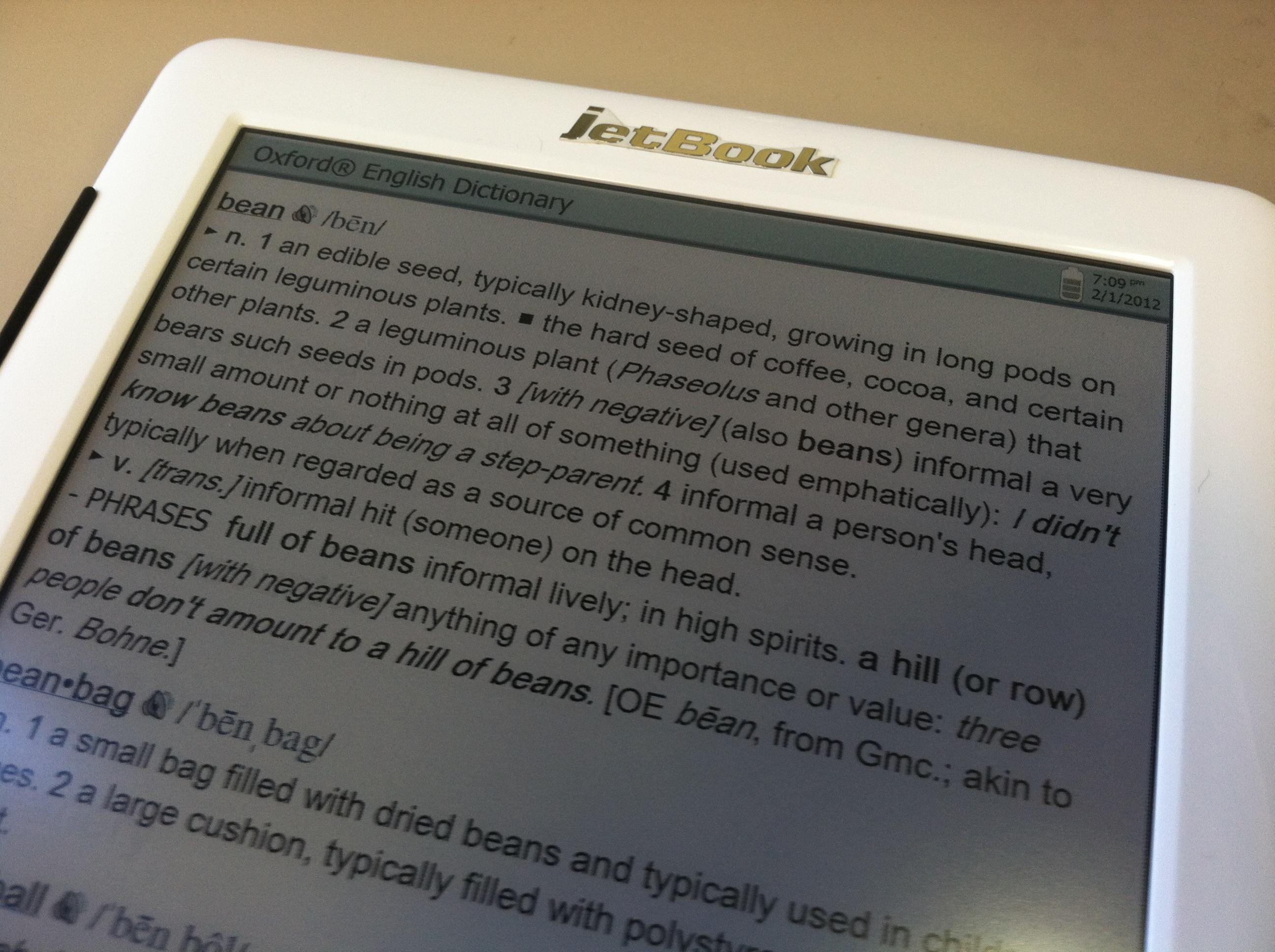 Casing and Main Screen The case for the jetBook Color is hard enough to protect it against falls and soft enough to make it feel pleasant to the touch. It also has a unique rigged (almost Louis Vuitton checkered) design instead of a lame matte finish with a strap that flips over and holds the case together. You can stand it up by pulling out a strap inside the case, and even fold it sideways for a panoramic view (I’ll show in later pictures). You can navigate using the buttons on the lower part of the device, or using the stylus that comes with it. Sometimes you have to double tap to get into a section, I usually click on the section to highlight it and then click the “OK” center key to access it – kinda like that way better. Sometimes the touch lags but it’s negligible. The main menu has 6 features: My Library, Recent Readings, Classwork and Homework, Oxford Reading Support, Language and Games, Science and Math, Audio Books and Music, Settings. My Library This is where you store your books. A great feature is that you can create folders to keep track of where you put your literature. I’ve loaded my professor’s PDF to this already and they look awesome, I know my mom loaded her documents for work as well. There is a 50 State Reading list programmed to mine which has about 70 books which is a nice addition. Highlighting: You hold the stylus to the start point, drag it to the end point, and then select “Menu” when it pops up. Here you’ll have the options to: Explain with Oxford, Translate in Dictionary, Translate (in their text translator – set to Spanish right now), and Mark for Summary (this is cool bc you can save the text you highlighted for later in a separate section – which you can then click the “Menu” key and access.) The “Menu” key when inside a book will bring up the following menu: Go to Page number, Go to Table of Contents, Text Search, Bookmarks, Show Summary, Change Font Size, Encoding, Book Language, Full Screen, and Help. There would be too many screenshots to have all of them shown here but if everyone wants I can definitely load them up. Recent Readings Self-explanatory Classwork and Homework This section is blocked. I called Ectaco about it and they told me it’s only available to schools right now. No biggie, makes the main screen look nice though. Oxford Reading Support This is the first section with subsections. I’ll go through each one separately below: Oxford English Dictionary – Here you can look up individual words and it will give you the definitions, parts of speech, examples, etc. You can also have the word pronounced fluently which is great. Talking Oxford English<->Spanish Dictionary – Similar design to the previous section but here you can additionally translate from English to Spanish and vice versa. Fluent pronunciation for both languages. SAT Preparation Course – This is insane. If I had this when I was in high school I would have killed it on the SAT! But since I have to be very neutral with this review I’ll write more about the functionality. It’s split into 6 sections ranging between Words, Critical Reading/Sentence Completion, Writing/Grammar, Writing/Vocabulary, Math/Problem Solving, and Essay Hints. You basically take an endless amount of tests, it tracks your performance so you can see how much better you do on each test, and gives you tips for each section. The letters A, B, and D were missing from my option choices (lol) but they still worked when selected, prob a small bug. ***Looks like I can't upload anymore pics right now so I will post a continued review below***PLEASE DON'T INTERRUPT THE POST BY POSTING YET!!!! |