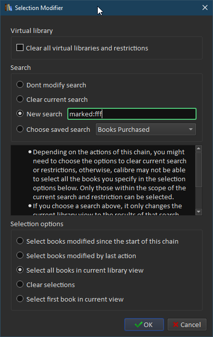 If 'mark added/updated books when finished' is enabled, these selection modifier settings will select all updated books. I created a chain with this selection modifier and then a chain caller to my fanfic cleanup chain. Seems to work as intended. Last edited by ownedbycats; 05-29-2024 at 08:35 PM. |