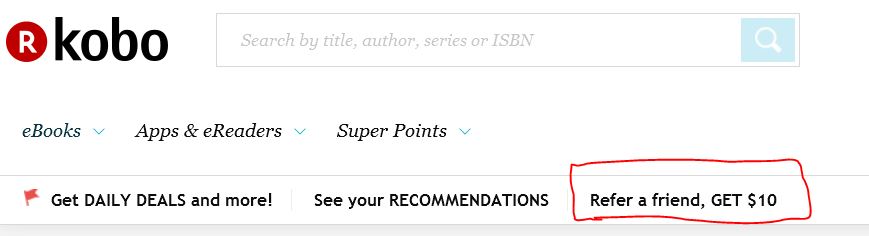 Give $5, Get $10 Give your friends $5 to try Kobo! For every friend that makes a purchase, you’ll also get a $10 account credit to expand your library. Terms & Conditions For each friend that makes their first ebook purchase of $5.01 or more through your invitation, we’ll add a $10 credit to your Kobo account within 8 business days. Credit will be applied to the account associated with your Kobo email address. Note: no end date showing. Also, whilst the promo header shows irrespective of whether you are logged in or not, you can only view the promo page if you are logged in. Edit: offer available in: AU NZ CA US (not the UK, India, Sth Africa) You'll find it: Last edited by Lynx-lynx; 04-07-2016 at 08:46 PM. |