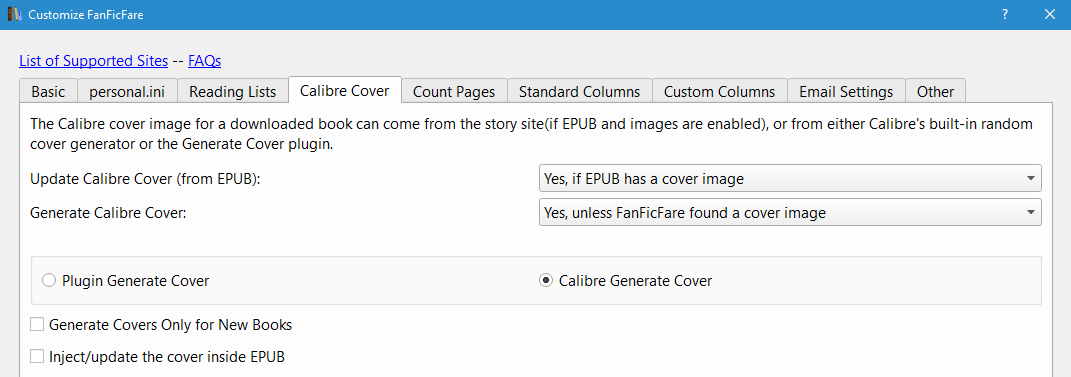 I'm trying to configure fanficfare to only use generate cover if and only if it doesn't find a cover with the story and I can't get it working at all