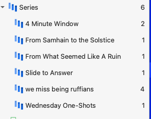 But now I'm perplexed by what is happening with my "we miss being ruffians" series data. I have both an anthology (marked 0 in the series) and three works in the series (marked 1, 2, 3). But this is how things look in the tag browser for my series. It shows just 1 work under "Series 1" but all four of them under my AO3 Series column. This isn't actually a problem for me given I intend to hide the Series 1, Series 2, Series 3 categories in the tag browser and just keep calibre's default series category/column and my AO3 series column. But it's weird, isn't it? See attached. |