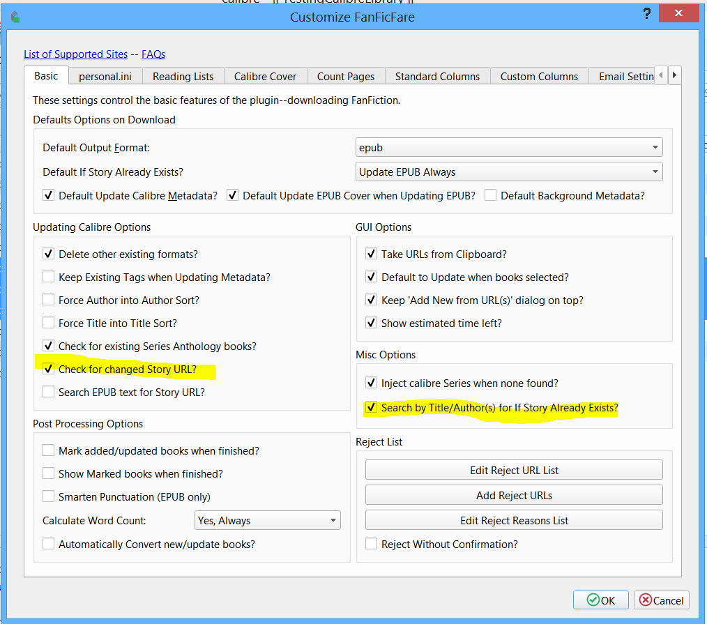 If you uncheck the option "Search by Title/Author(s) for If Story Already Exists?" FFF will only match by URL (and thus never ask to change URL). New URL==new story, even if there's a title/auth match. Or instead you can keep "Search by Title/Author(s)" on and uncheck the "Check for changed Story URL?" option and FFF will silently change the URL when there's a title/auth match. See attached. |