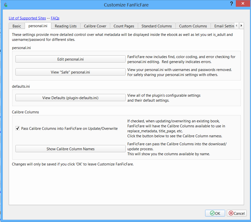 2016-03-11 - Make HTTP 410 StoryDoesNotExist in tthfanfic.org, make conn fail trace debug, not error level. - Allow a second kind of 'chapter missing' for portkey.org. - Change fanfiction.mugglenet.com to base_efiction after site update. - Hide user/pass in debug log, add 'View Safe personal.ini' option that also hides user/pass. - Re-organize personal.ini config tab in plugin. See attached for the changes to personal.ini config tab. |
